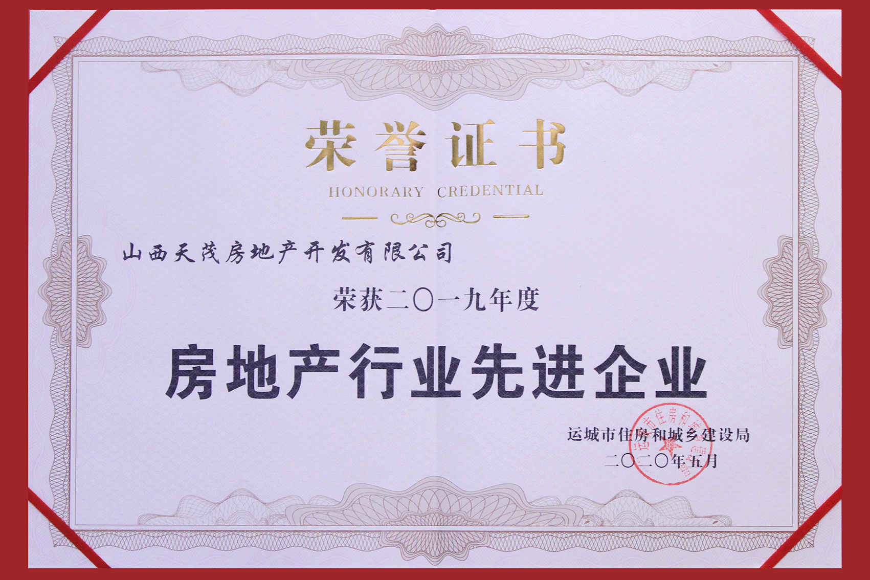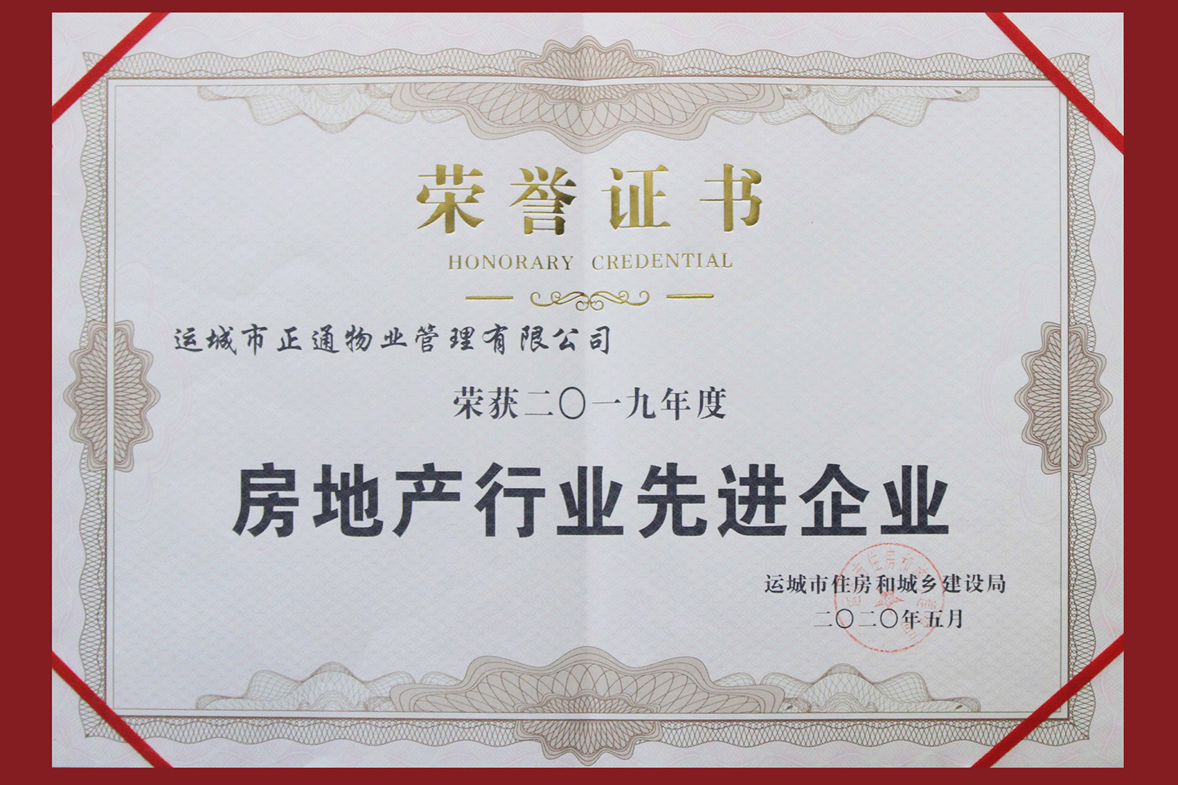▲運(yùn)城市正通物業(yè)管理有限公司榮獲“2019年度房地產(chǎn)行業(yè)先進(jìn)企業(yè)”