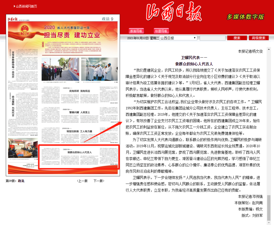 “為切實維護農(nóng)民工合法權(quán)益,我們企業(yè)帶頭做好涉及農(nóng)民工的各項工作。”衛(wèi)耀民1992年到西建集團工作。先后任集團運城分公司技術(shù)負(fù)責(zé)人、主任工程師、技術(shù)總工,西建集團副總經(jīng)理。2019年,他提交的《關(guān)于加速落實農(nóng)民工工資保障金差異化的建議》,有效改善了企業(yè)支付農(nóng)民工工資難的困境。他所在的西建集團成立39年來,始終把農(nóng)民工的利益放在首位,從不拖欠農(nóng)民工一分錢工資,企業(yè)建立了農(nóng)民工實名制臺賬,確保農(nóng)民工工資正常發(fā)放;企業(yè)每年都會為農(nóng)民工兄弟免費健康體檢等。