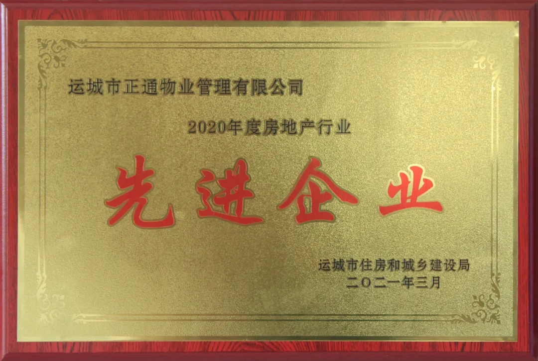 ▲運城市正通物業管理有限公司榮獲“2020年度房地產行業先進企業”