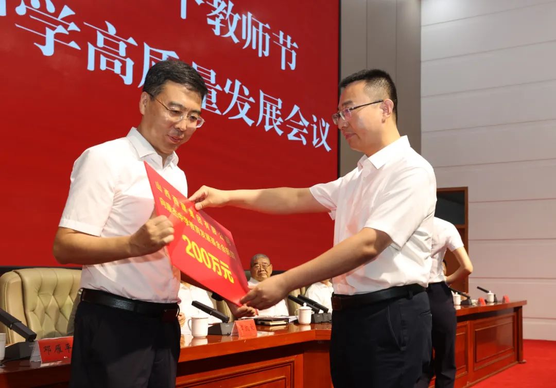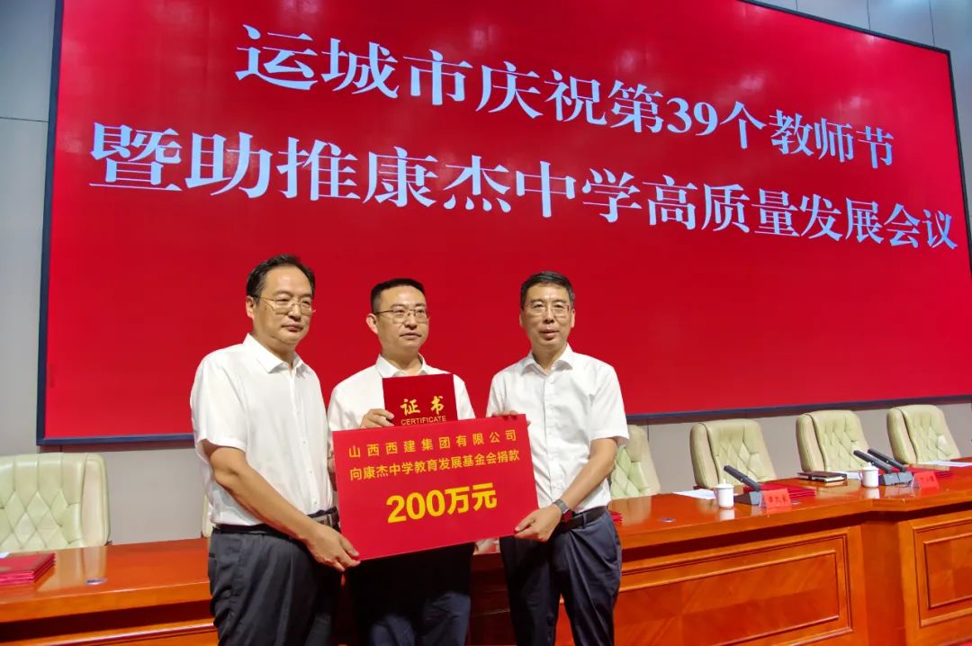 西建集團(tuán)向康杰中學(xué)教育發(fā)展基金會捐款200萬元在第39個(gè)教師節(jié)即將來臨之際,9月7日,市委、市政府在康杰中學(xué)隆重召開全市慶祝第39個(gè)教師節(jié)暨助推康杰中學(xué)高質(zhì)量發(fā)展會議。市委書記丁小強(qiáng)出席會議并講話。康杰中學(xué)杰出校友、北京理工大學(xué)原黨委書記焦文俊,康杰中學(xué)杰出校友、國防大學(xué)原少將譚凱家,市領(lǐng)導(dǎo)鄧雁平、張潤喜、喬登州等出席會議。市委副書記、政法委書記王立剛作教師節(jié)致辭。市委常委、常務(wù)副市長陳杰主持。副市長梁清燕就成立康杰中學(xué)教育發(fā)展基金會作說明。西建天茂房產(chǎn)總經(jīng)理劉忠森參會,西建集團(tuán)向康杰中學(xué)教育發(fā)展基金會捐款200萬元。